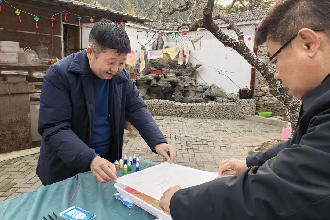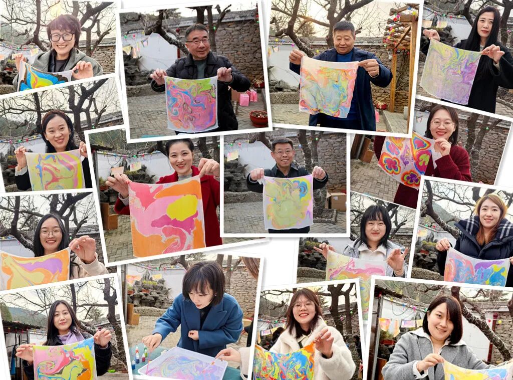 品嘗完甜蜜的糖葫蘆,大家又紛紛投入到水拓畫絲巾活動(dòng)中。創(chuàng)作、水拓、固色再到晾干,隨著一幅幅色彩斑斕的畫作拓印于絲巾之上,大家由衷地發(fā)出歡呼和贊嘆,欣賞著這份獨(dú)一無二的美,感受非物質(zhì)文化遺產(chǎn)水拓畫的獨(dú)特魅力。水拓絲巾的制作不僅考驗(yàn)著大家的耐心與細(xì)心,更是一次對(duì)美的追求與探索。